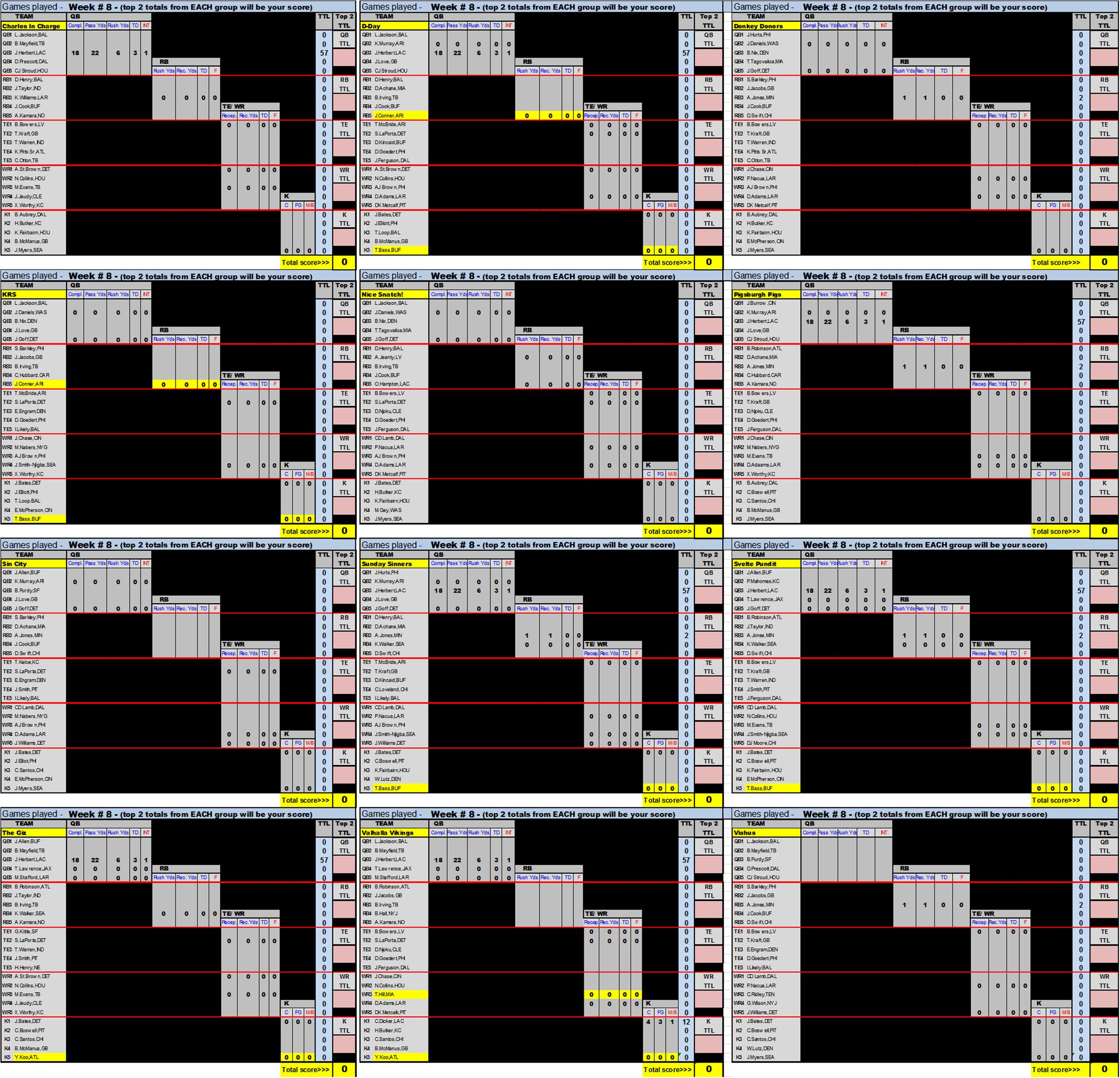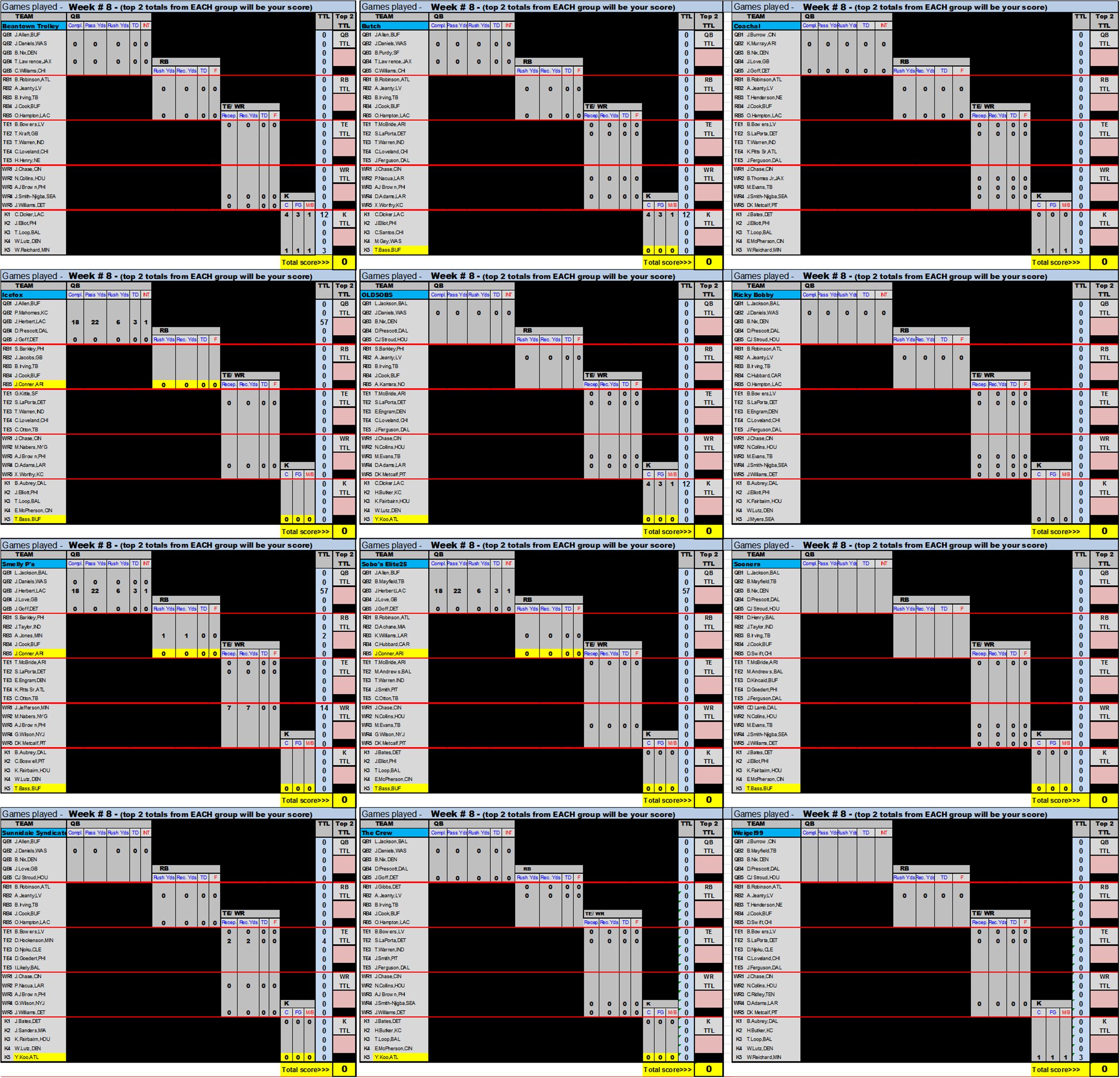 TOTAL pts earned each week will constitute your teams score for that week of schedule. (see schedule below). There will be NO substitutions