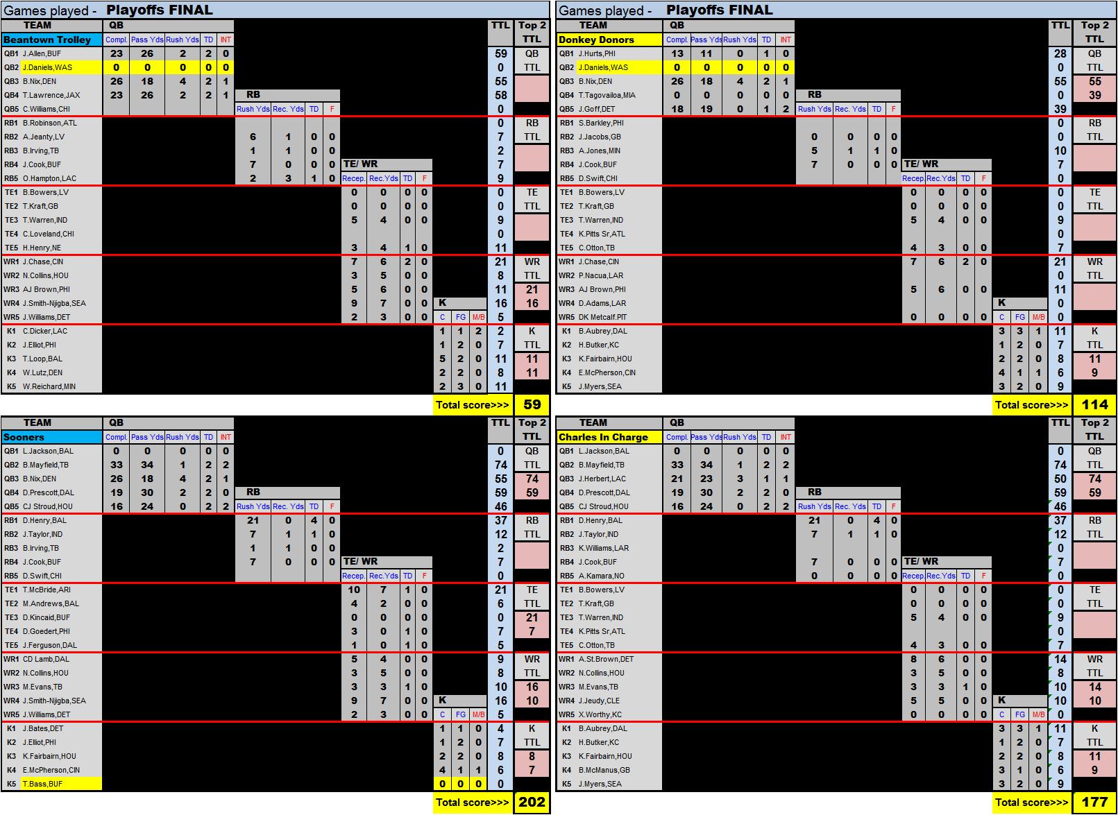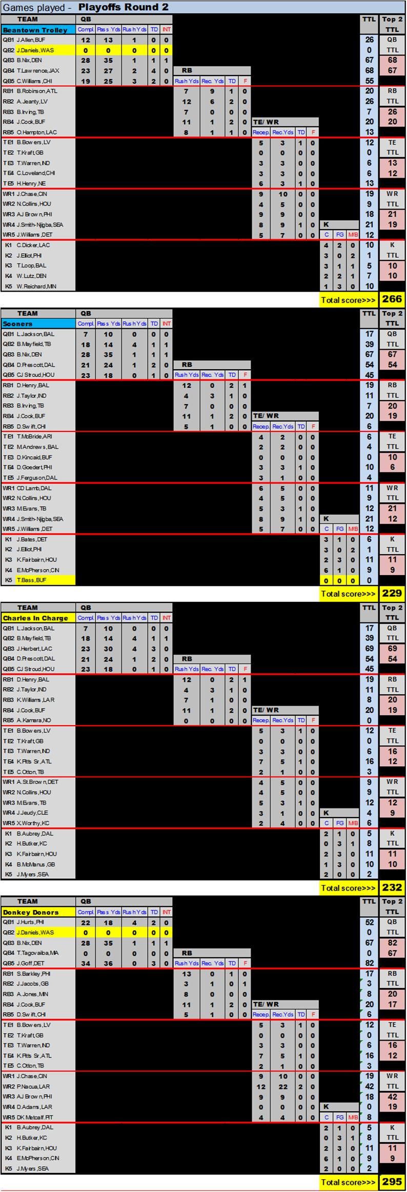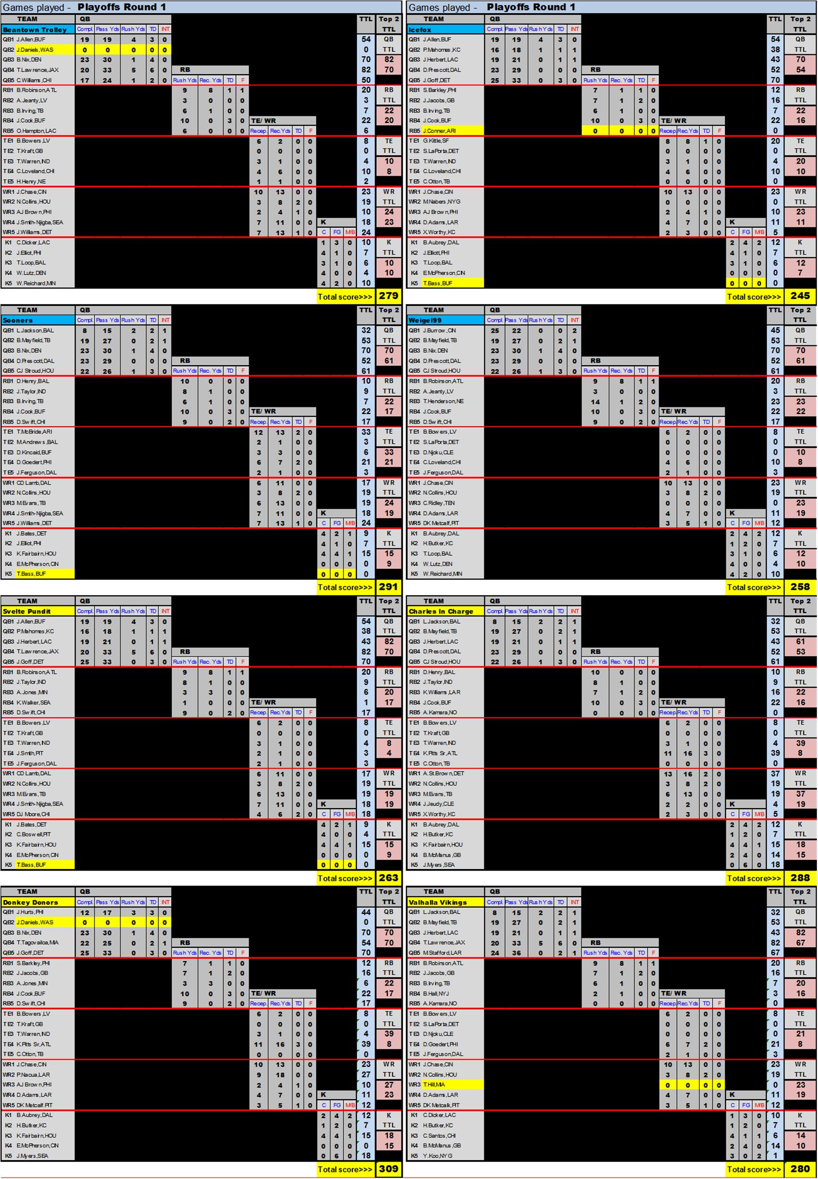 Scoring: QB's get 1 pt per completion + 1 pt per 10 yds passing + 1 pt per 10 yds rushing + 4 pts per TD thrown/scored.(QB will LOSE 1 pt for every