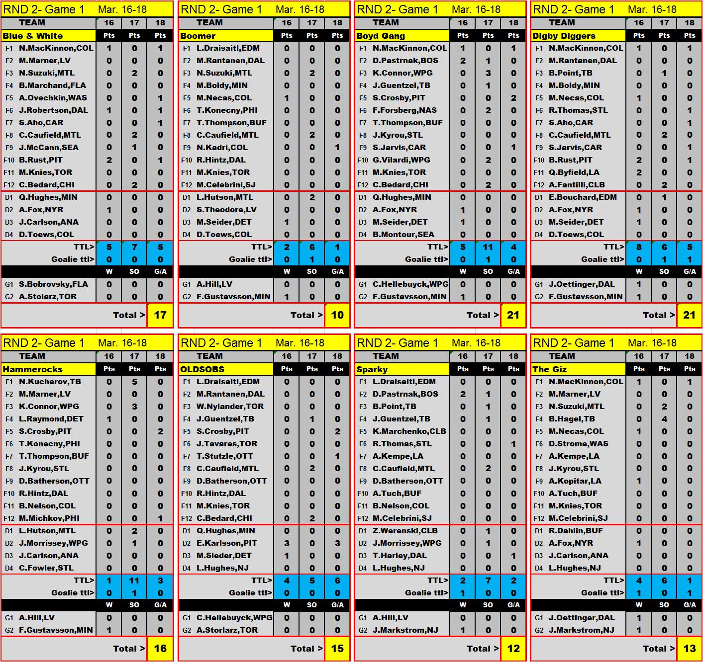 assist, each goalie earns 1 pt per win,